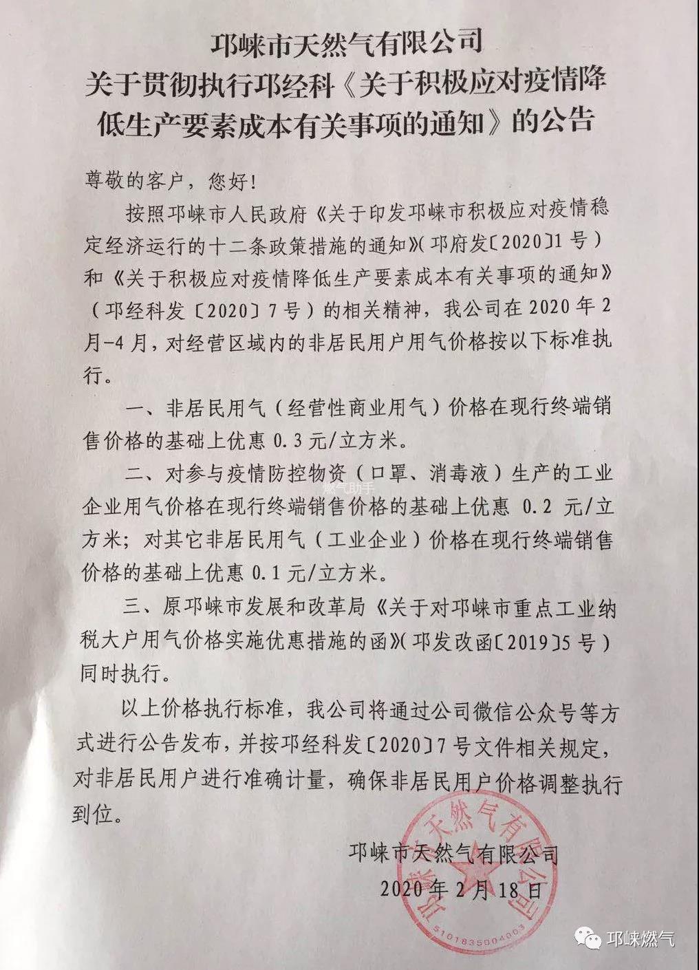 邛崃市天然气有限公司关于贯彻执行邛经科《关于积极应对疫情降低生产要素成本有关事项的通知》的公告